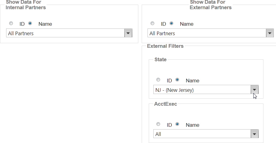 Most pages with filters let you select an individual external and internal partner for the report.