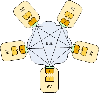 The diagram shows this topology with five process instances. Any process on this bus can send messages to all of its peers and receive messages from all of its peers.