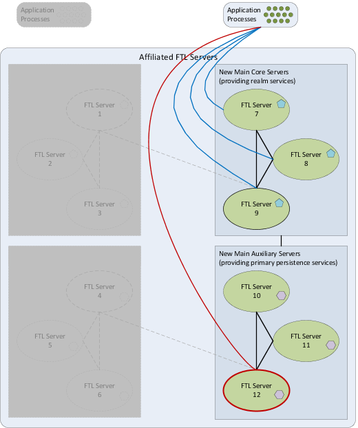 At each site, each of three core FTL servers explicitly provides a realm service (blue pentagon). Similarly, three auxiliary servers provide a cluster of persistence services (purple hexagons).