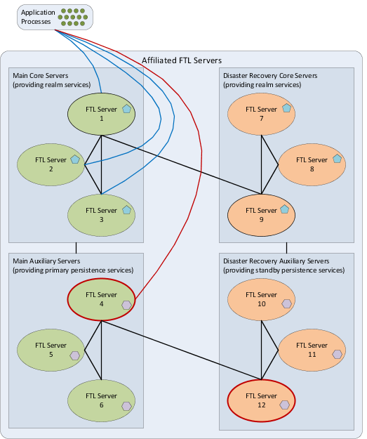 The first diagram illustrates a set of FTL servers configured to prepare for recovery from a potential disaster, along with the services they provide and the application processes that they serve. Servers at the main site are on the left (green). Components at the disaster recovery site are on the right (orange).