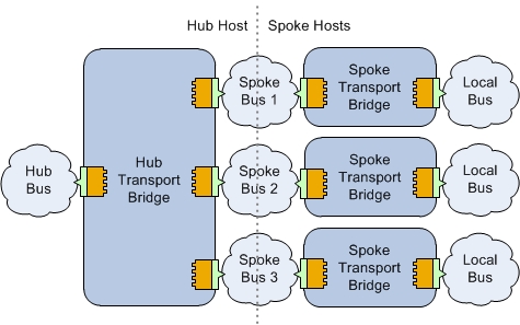 You may extend this topology by adding transport sets, or by adding transports to the transport sets. You may extend this topology by adding more spokes, each consisting of a spoke bus, a spoke bridge, and a local bus.