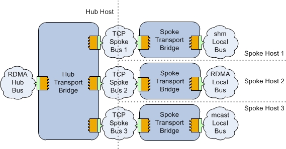 - It uses transport sets to isolate data. The hub transport bridge (left) configures the RDMA hub transport in one transport set, and collects all the spoke transports in a second transport set. This configuration forwards data from the hub bus to all spoke buses, and forwards data from each spoke bus to the hub bus. Meanwhile, this configuration isolates data from the various spoke buses. The hub bridge does not forward from one spoke to another spoke.