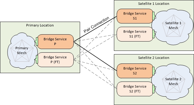 To bridge the meshes requires a bridge service at each location (orange), and a bridge definition that links the locations using a pair of static TCP listen and connect definitions. Include the listen end at the primary location, and the connect end at the satellite locations. The resulting pair connections link each of the satellite bridge services to the primary bridge service (solid lines). (Ensure that the static TCP port is open on the bridge service host computers.)