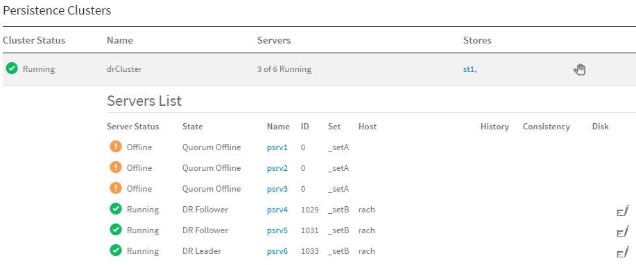 The two clusters of FTL servers at the primary and disaster recover sites are separate, as are the two sets of persistence services that they manage. Each FTL server cluster displays the status of only those persistence services at its local site.