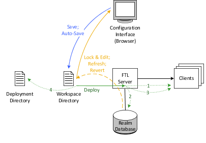 - When edit mode on, the interface accesses a workspace, that is, a private working copy of the realm definition, which it uses as intermediate storage while the administrator modifies the realm definition. Entering edit mode (orange arrow) obtains the modification lock and opens the workspace as a copy of the current realm definition. The interface displays the workspace and automatically saves your modifications to the workspace (blue arrows).