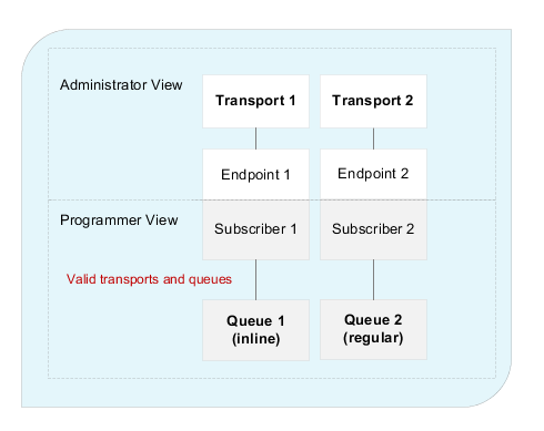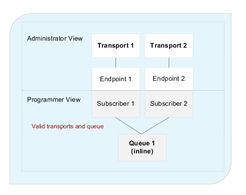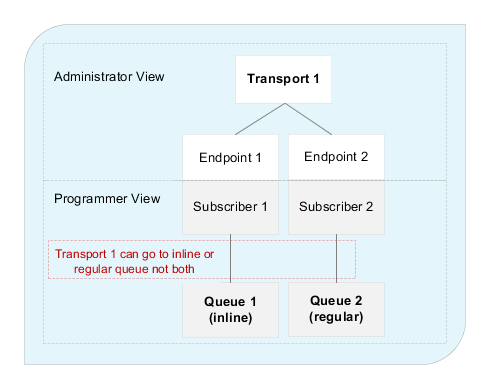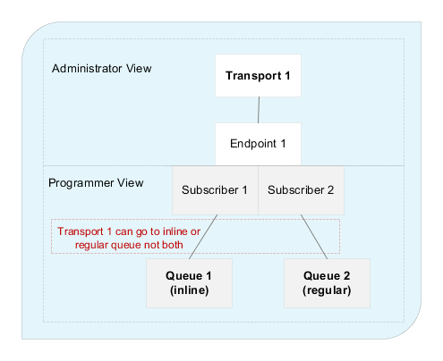 From a programmer’s perspective, transports are ordinarily hidden behind endpoint names. Conversely, administrators can ordinarily employ transports to implement endpoints without understanding the specifics of subscribers and queues in application programs. However, inline mode tightly couples transport I/O to program code, which in turn blurs the usual separation of responsibilities between programmer and administrator. As a result, the restriction requires that programmers and administrators coordinate whenever a program uses inline event queues.
