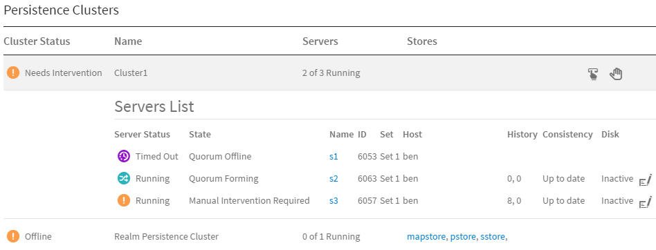 The two reachable services cannot form a quorum because s2 is empty (see Quorum Conditions: General Rule). If the administrator determines that s1 has actually exited, then it is safe to force a quorum. The administrator can explicitly force a quorum using the force quorum command icon in the cluster row of the persistence clusters status table.