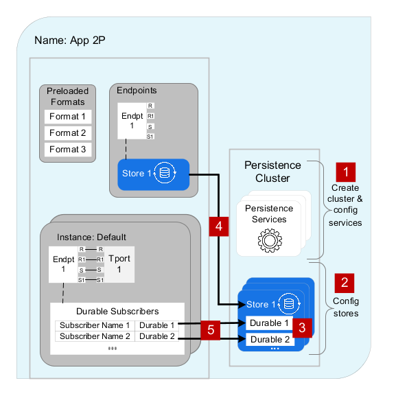 The realm definition schematic in the following diagram indicates five configuration tasks for persistence stores and durables. (Numbers in the diagram correspond to the task steps that follow.)