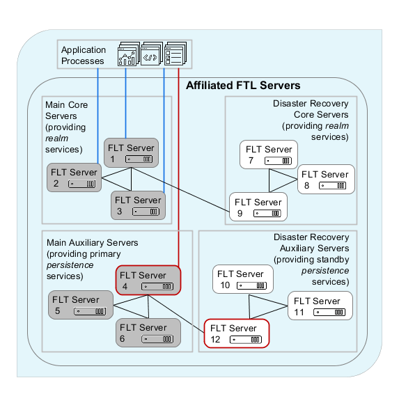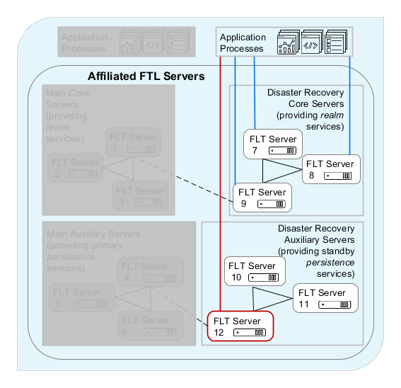 The first diagram (above) illustrates a set of FTL servers configured to prepare for recovery from a potential disaster, along with the services they provide and the application processes that they serve. Servers at the main site are on the left (gray). Components at the disaster recovery site are on the right (white).