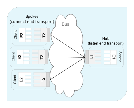 Hub-and-spoke topology characterizes a server with many clients. Configure one listen end transport definition for the hub and one connect end transport definition for all the spokes. Start the hub application, then start the spoke applications.