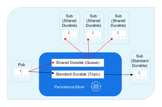 A standard durable is equivalent to a topic. Black arrows in the diagram indicate delivery of each message to both subscribers.