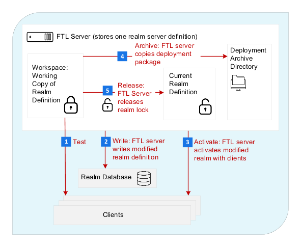 OK(test succeeds) or an administrator forces the deployment to continue, the server proceeds to the next step. Otherwise the server rolls back the transaction. - Write. The FTL server writes the modified workspace realm definition to its database.