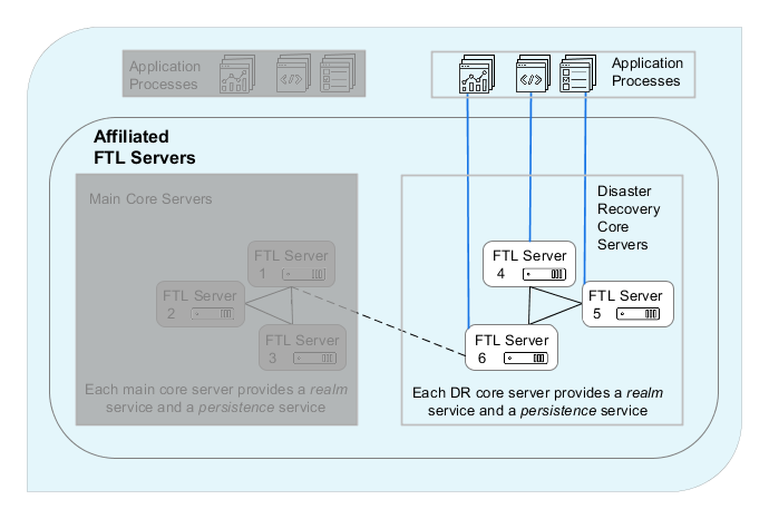The diagram above illustrates a set of FTL servers configured to prepare for recovery from a potential disaster, along with the services they provide and the application processes that they serve. Servers at the main site are on the left (gray). Components at the disaster recovery site are on the right (white).