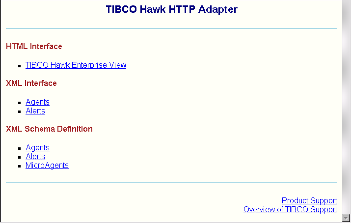 If the starting URL for your configuration contains special characters, follow the standard encoding rule for URLs.The TIBCO Hawk HTTP Adapter index page is shown below. From this page you can do the following: