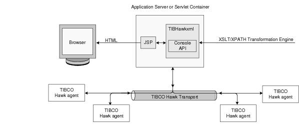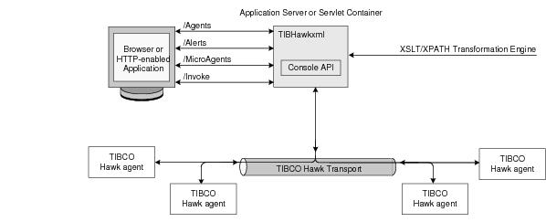 The architecture of the TIBCO Hawk HTTP Adapter is illustrated below. Figure 1 shows how TIBCO Hawk servlets use the TIBCO Hawk Console API to talk to TIBCO Hawk agents over TIBCO Hawk Transport.