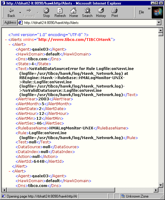 Invoking this relative URL generates an XML instance document listing all active alerts and informational messages in all agents in all of the TIBCO Hawk domains listed in