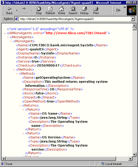 Invoking this relative URL on a specified agent generates an XML instance document listing the microagents on that agent.Figure 5 MicroAgents URL Sample OutputRequired parameters for the MicroAgents URL are: