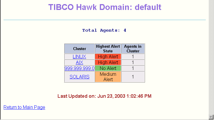 All TIBCO Hawk domains in the enterprise that are configured in the web.xml file. All methods in the selected microagent on the selected agent. All pages have a Return to Main page link that takes you back to the TIBCO Hawk HTTP Adapter Index Page.Many of the HTML pages contain an alert state indicator in a column titled Highest Alert State. The alert level shown in this column is the highest current alert state in any of the agents in that cluster. Other lower-level alerts and informational messages may also currently exist in the agent; only the highest active alert level is shown in this field.