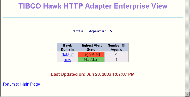 In the Enterprise view, you see an overview of all monitored TIBCO Hawk domains in your enterprise.The Hawk Domain column lists the names of the domains being monitored. The Highest Alert State column indicates the highest current alert state in each domain, and the Number of Agents column indicates how many agents are in each domain.