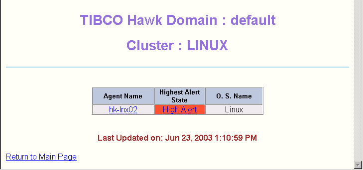 This screen appears when you click a cluster name in the Domain View. It displays information about the agents in the selected cluster.
