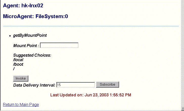 This view displays the parameters in the method selected in the Microagent View. The available parameters for the method vary depending on the method signature.The sample screen above shows the getByMountPoint synchronous method in the FileSystem:0 microagent, in the hk-lnx02 agent.