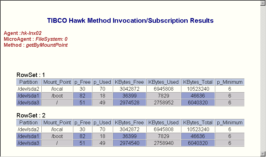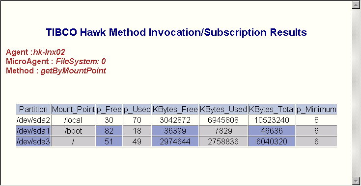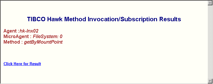 • Invoke (asynchronous method) or Subscribe (synchronous method) returns this page with a link to open a new browser window. The new window is refreshed every five seconds with the current value of the method, independent of the Data Delivery Interval specified in the Method Details view.You can leave this browser window open while you continue to work in the sample HTML interface. TIBCO Hawk HTTP Adapter terminates the subscription or invocation five minutes after one of the following happens:The look and feel of these screens can be customized using index.css and Result.xsl as described in Customizing the HTML Application.The sample screen above shows the Method Results window for an Invoke (synchronous method) request.The sample screen above shows the Method Results window for an Invoke (asynchronous method) or Subscribe (synchronous method) request. Click Click here for Result to open a new browser window.