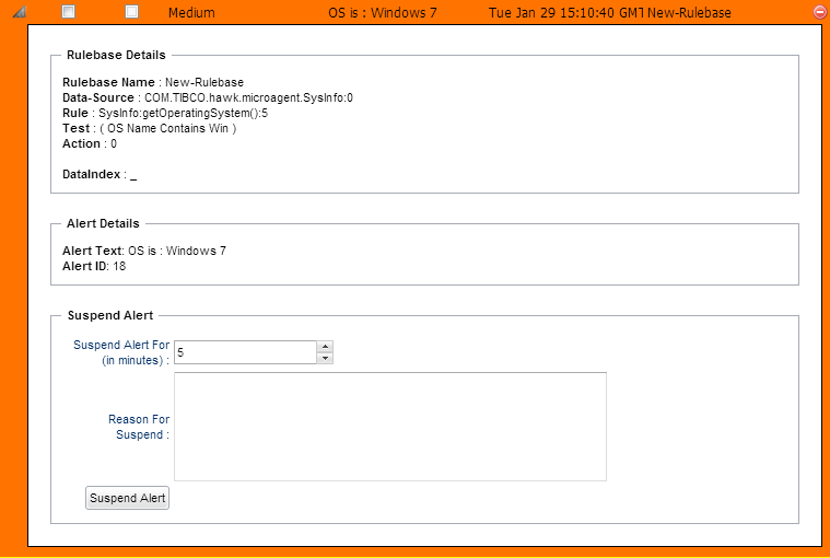 − Suspend Alert: This section is used to specify details for temporarily suspending an alert. See Suspending Alert Messages for further details.