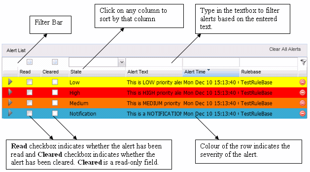 7. Click Clear All Alerts to remove alert entries from Alert List.Viewing details for an alert message automatically selects the Read checkbox in the Alert List. You can also manually select or unselect this field. As the Alert List continuously updates, this feature helps you track alerts that have already been reviewed.