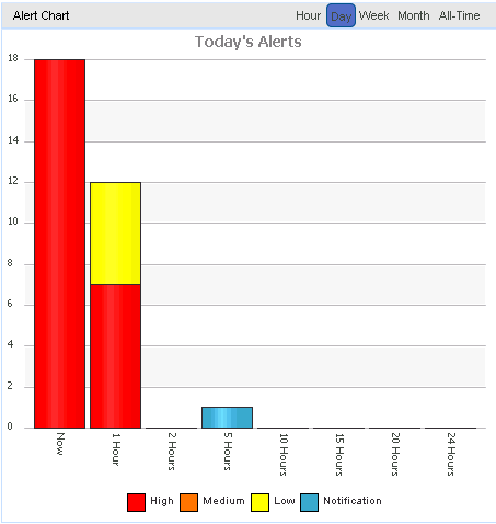 − Alerts are displayed under each of these sub-intervals. One common sub-interval for Hour, Day, Week, Month and All-time options is called the Now sub-interval. All live alerts are displayed in the Now sub-interval until they can be transferred to the next available sub-interval.Figure 7 Chart TabFor example: You choose the Day option. The moment an alert is generated, it is displayed under the Now sub-interval. The next available sub-interval is 1 Hour. As soon as alerts is 1 hour old, it is transferred from the Now sub-interval to the 1 Hour sub-interval. Similarly, alerts which were earlier displayed in 1 Hour sub-interval are transferred to 2 Hours sub-interval and so on.