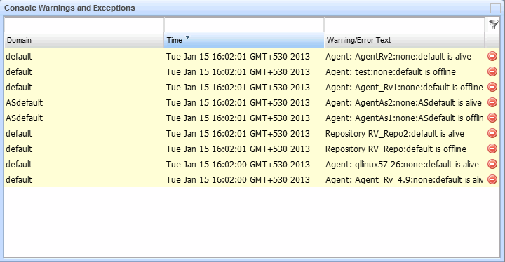 Clicking on this icon will open the Console Warning and Exceptions window to the foreground. The following figure shows the Console Warning and Exceptions window: