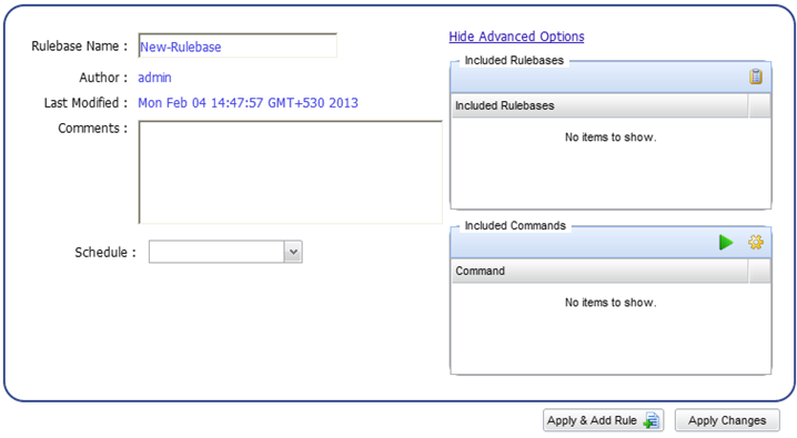 8. Click the Apply Changes button to save the current changes. These changes are available in the browser till the user logs out.A rulebase must have at least one rule, a rule must have at least one test, and a test must have at least one action.A rulebase can include other rulebases which can automatically load when the rulebase is loaded by an agent. The Included Rulebases feature is useful for maintaining modular rulebase sets. For example, if rulebase A should always be loaded with rulebase B, rulebase B can have A as a member of it’s include list.Similarly, the Included Commands feature can be used to add any command to a rulebase, but rulebase commands are typically related to the resources or activities that the rulebase monitors. For example, if a rulebase is monitoring the httpd daemon, the commands could execute scripts such as: start_httpd or kill_httpd.