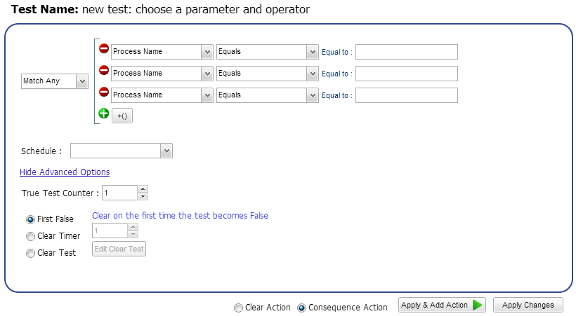 6. Click the Apply Changes button to save the test.A test includes the test expression (such as Processes > 10) and any extra conditions, such as counters, timers and additional tests. These advanced options add extra requirements for a test to evaluate as true or false.