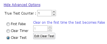 − Clear Timer: Specify a wait interval in seconds. After the test becomes true it remains true until this interval has passed without an additional true test. This is the default behavior for a test with an asynchronous data source, and the default wait interval is 900 seconds (15 minutes).