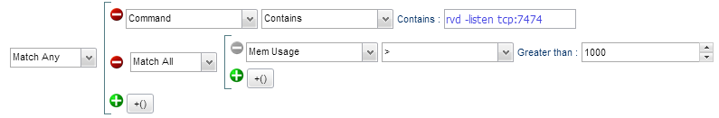 5. Click the Apply Changes button to insert the expression into the highlighted set of parentheses. The compound test now looks like the following:This test evaluates to true when the specified rvd process uses more than 1000 Kilobytes, or 1 MB of memory. If the memory threshold is exceeded, the test could trigger an action for restarting the process and notifying the system administrator. For more information, see Creating Actions.Processes named rvd that were started using different parameters, such as -listen tcp:7475 are unaffected.