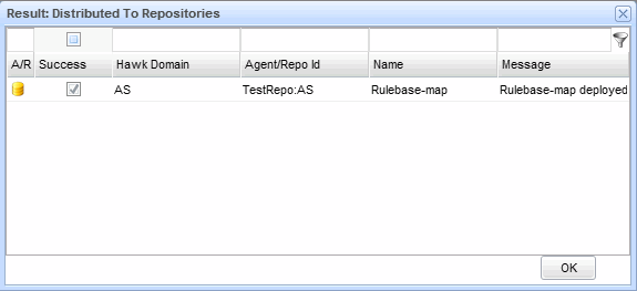 3. Click OK after viewing the results.The rulebase map is sent to the selected Repository or Repositories. Agents that use these Repositories use the rulebase map the next time they are started.