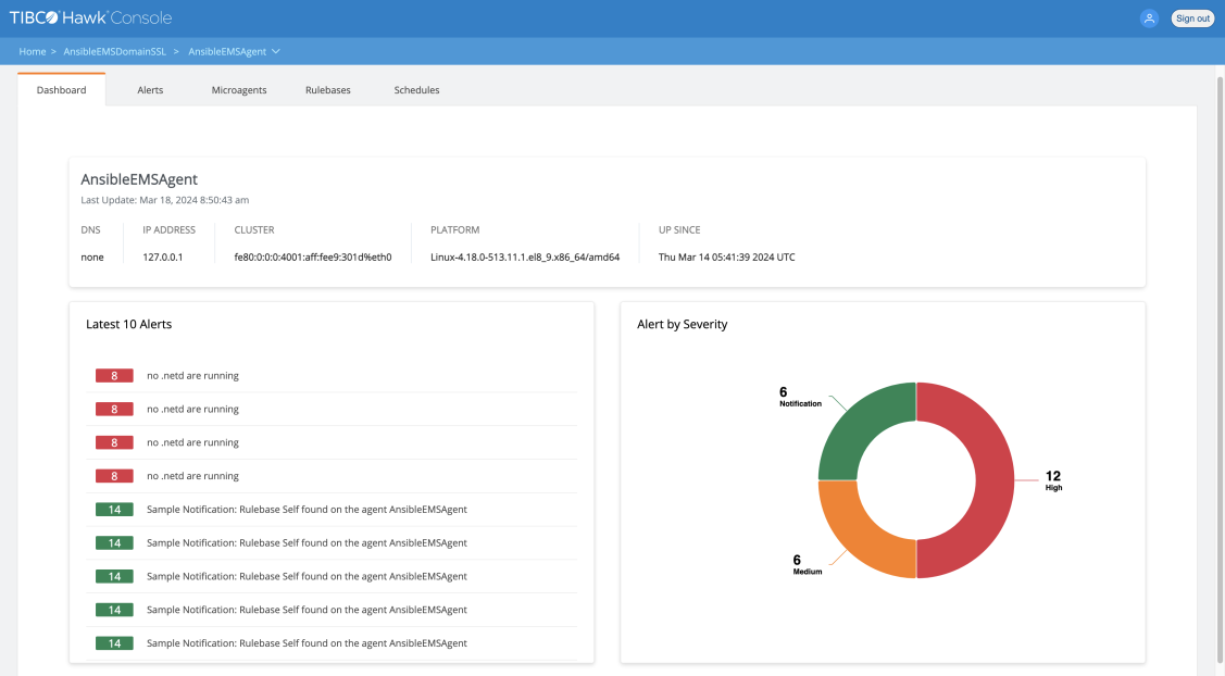 | • | Latest 10 Alerts - The section lists most recent ten alerts for the Hawk agent. |