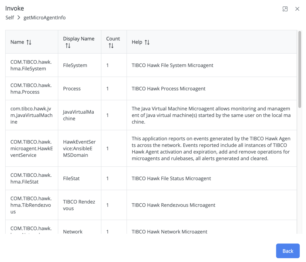 | 4. | Under the Actions column, click the Invoke icon to invoke the microagent method. |