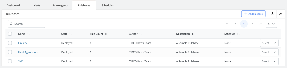 The Rulebases tab shows all the rulebases for the agent. You can select the number of rulebases displayed on a page by selecting 5, 10 or 20 from the records per page drop-down menu.