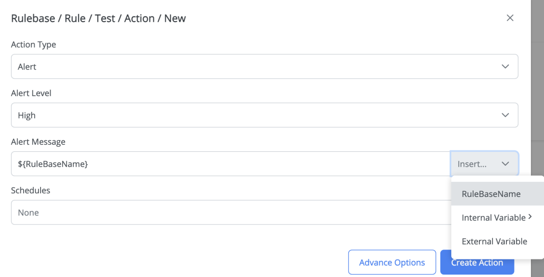 You can use rulebase internal variables while defining rulebase alert actions message, along with microagent specific variables in the alert message text. For example, in a rulebase with Self microagent as the data source, you can choose rulebase internal variables such as rulebase name, rule name, test name, and so on. You can also use Self microagent specific variables such as RuleBaseName, Internal Variable, External Variable in your alert message text. For details, see Variables in a Rulebase.