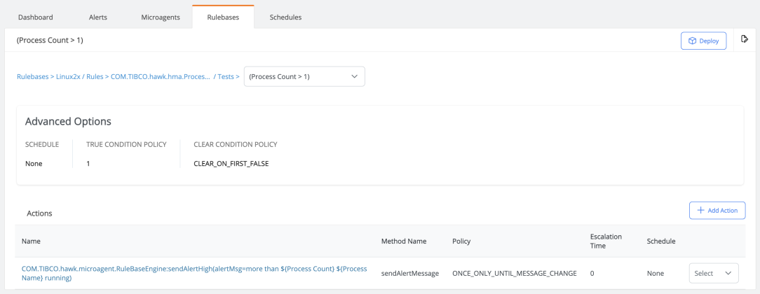 | • | Deploy the rulebase - Click the Deploy to deploy the rulebase to the Hawk agent. For details, see Deploying a Rulebase to the Associated Hawk Agent. |