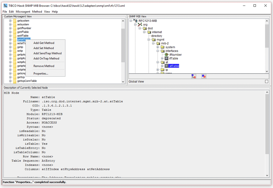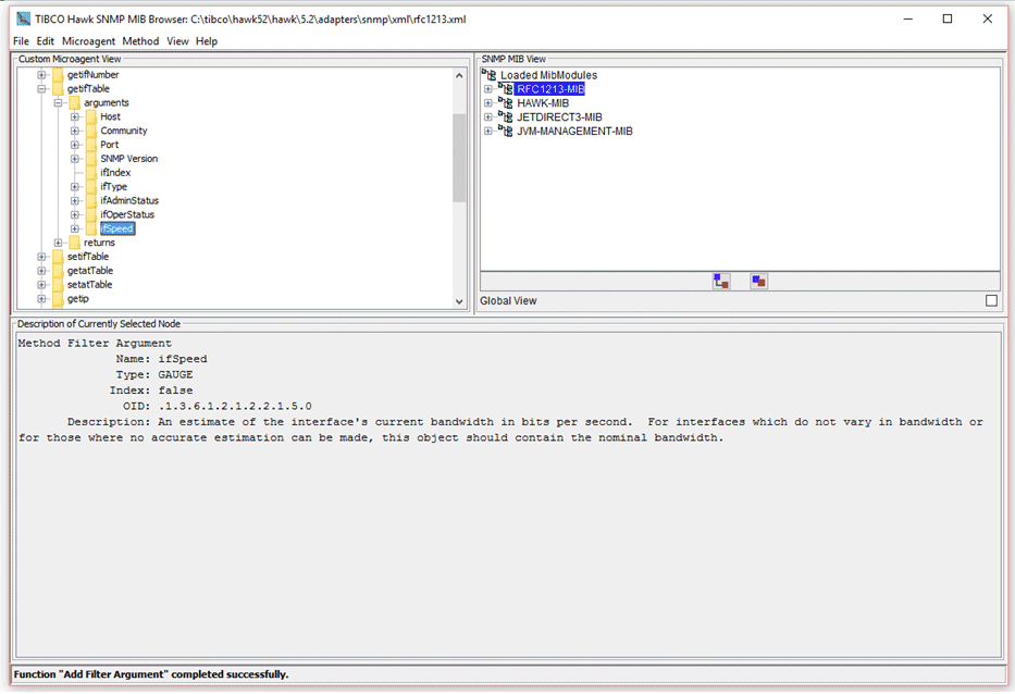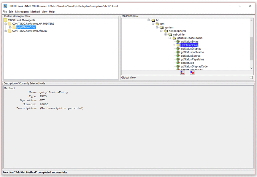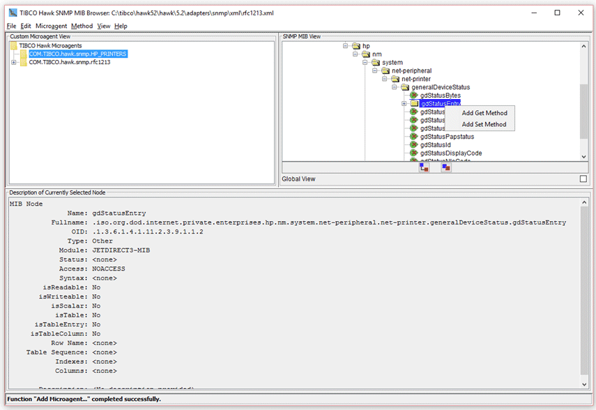 6. A new method named getgdStatusEntry is added to the selected microagent in the microagent tree. The method name is derived from the operation (get) and the MIB item name (gdStatusEntry). Expanding the getgdStatusEntry tree node, note that method arguments and returns have been automatically generated from the MIB definition.The standard arguments Host, Community, Port, and SNMP are automatically added where appropriate to allow these values to be specified when the method is invoked. These standard arguments have default values of localhost, public, 161, and version 1, respectively. The Port argument defaults to 162 for sendTrap methods.For the get() methods, a return is defined for each MIB variable from the selected MIB node. If the node represents a terminal node, a single return is added for that variable. If the node represents a non-terminal node (for example, gdStatusEntry), a return is added for each terminal node contained in that node. If the node represents a table, a return is added for each column of the table.For onTrap methods a return is added for each variable defined for the selected trap.For sendTrap methods an argument is added for each variable associated with the selected trap.Filter arguments can be added to get methods which return tabular data and to onTrap methods. A filter argument corresponds to a particular return and is used to filter the data returned by a method. For tabular get methods they are used to filter which table rows are to be returned. For onTrap methods they are used to filter out unwanted traps. Filter arguments are automatically added for all table index columns in tabular get methods. A filter argument can be added for any return. If the return is an enumerated type then a legal value choice is defined for the filter argument containing the list of enumerated types.