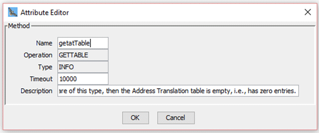 7. Select the File->Save options to save the microagent descriptor file.When working with OnTrap methods or methods that return tabular data you can specify any output parameter of the method as a filter argument. This adds an output filter argument corresponding to the selected output parameter. You can now filter the returned data using specific values for this output filter argument.When used with OnTrap methods, the output filter is used to send only those traps that pass the filter criteria. Similarly, with methods that return tabular data, the output filter is used to filter rows of the return data.To add a filter argument, right click on the selected output parameter and choose Add Filter Argument.To edit the properties of a node in the custom microagent tree, right-click on that node and choose the Properties... option.This brings up the Attribute Editor containing the properties of the selected node. The properties that can be edited are displayed with a white background: