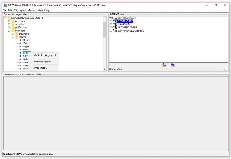 The SNMP MIB can be presented in either MIB or trap view. The MIB view tree shows the SNMP variables defined in the loaded MIBs and is used for creating get and set methods. The trap view tree shows the SNMP traps defined in the loaded MIBs and is used for creating onTrap (to receive traps) and sendTrap methods. You can switch between views using the View menu.