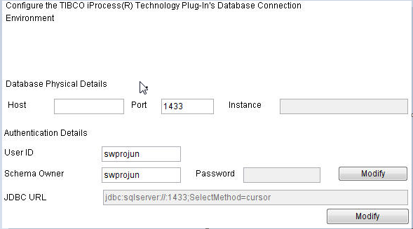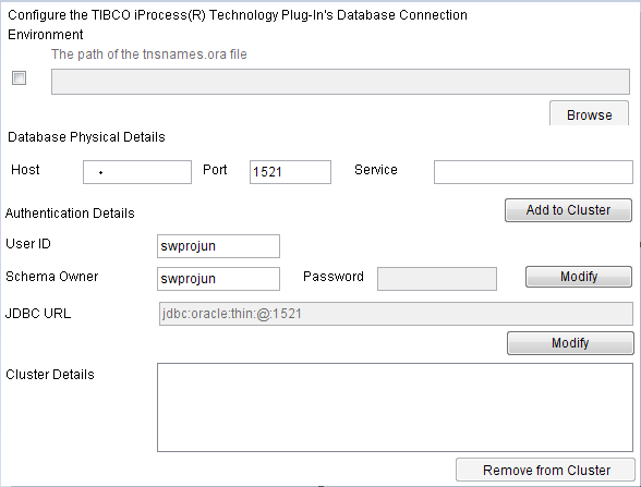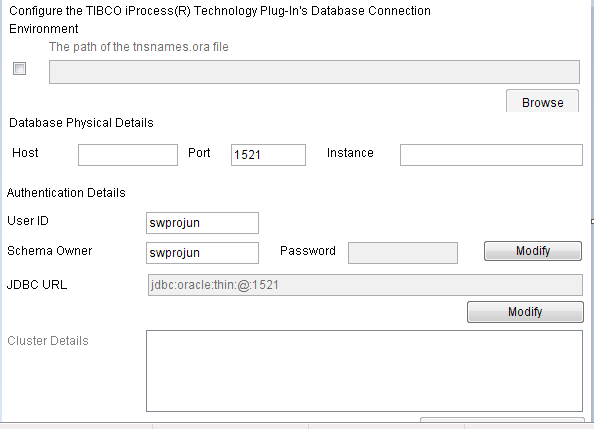 tnsnames.ora file is used, the connection string in the JDBC URL field, that is jdbc:oracle:thin:@SID, is recorded in the eaijavaplugin.properties file, which is located in the SWDIR/eaijava directory of the machine on which TIBCO iProcess Engine is installed. |