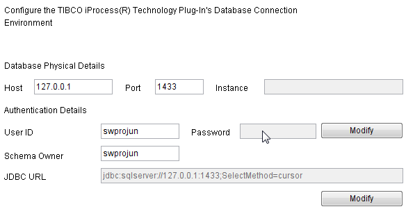This field contains the password for the iProcess Engine database user. If you have to set or change this password, click Modify and the Modify Password dialog is displayed. Enter the correct password and click OK and the Database Configuration dialog (Continued) is returned. Note: You do not have to specify this field if SQL Server (Windows Authentication) is selected from the Database Type list.