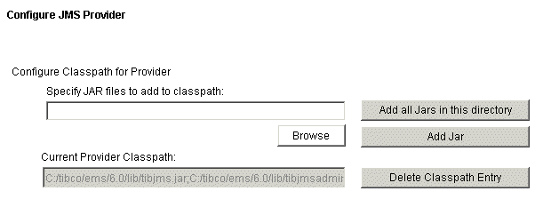 Note: If you are upgrading from a previous version of TIBCO iProcess Technology Plug-ins, the existing path to tibjms.jar appears here, but you must add the tibjmsadmin.jarandjms-2.0.jar (Only when you use TIBCO EMS version 8.x or above as the JMS provider) files manually.