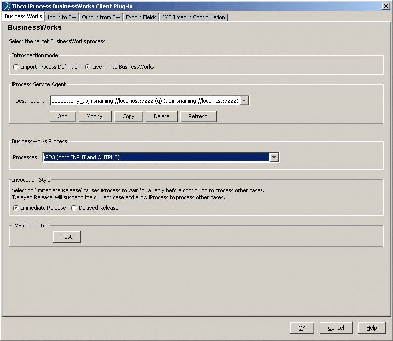 Whether you choose to configure the JMS provider information using the JMS Administration Tool or from the BusinessWorks Step Definition wizard, the dialogs are the same. The following section describes how to configure these dialogs in more detail. See Managing JMS Destinations and Managing JMS Providers for more information.