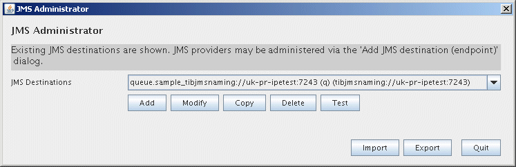 You can also export and import your JMS provider configuration information from one iProcess Engine database to another using the JMS Administration Tool. This is useful, for example, if you want to migrate your iProcess Engine environment from a Development environment to a Production environment. See Importing and Exporting JMS Configuration Information from the iProcess Engine Database.