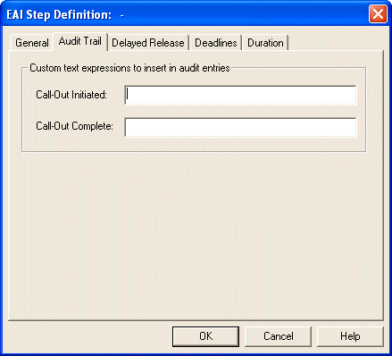 | 2. | Click the Audit Trail tab to define custom audit trail entry expressions. This enables you to define text expressions that are evaluated when the step is processed and inserted as the %USER value in the audit trail entries. |