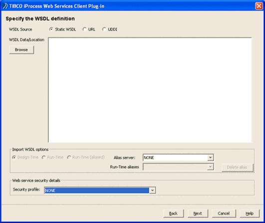 Specify that you have a WSDL template that you want to use. You can paste the WSDL contents into the WSDL Data/Location text area (see the following section). |